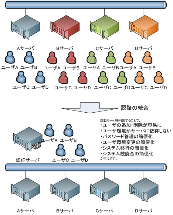 複数のコンピュータで構成されるシステムを運用、管理する場合、そのユーザ管理が非常に煩雑になります。1台1台のコンピュータにアカウント(ログインするためのユーザ)を作成し、パスワード管理などを行っている場合、管理者業務としては、ユーザの追加・削除が煩雑